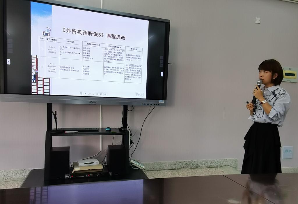 研讨会上,郑晓琳老师代表财务管理教研室发言,她从课程思政的要义、如何结合教学融入思政元素以及《财务管理》课程实践来分享交流。她以在全面分析课程内容的前提下,将集体主义精神、“储蓄理财与风险意识”、 “创新创业教育”、社会主义核心价值观等思政元素融入课程教学中,力求达到形式多样、与时俱进、润物无声的课程思政效果;周梅老师代表国贸专业教研室发言,她以《外贸英语听说》、《国际贸易基础》等课程为例进行了教学演示,以生动案例展现了在日常课堂教学中如何把国家意识、政治认同、文化自信、人格养成等思政元素与专业知识、专业技能的传授有机融合的实践探索,将外语教育过程变成外语教学领域社会主义核心价值观教育的重要阵地。