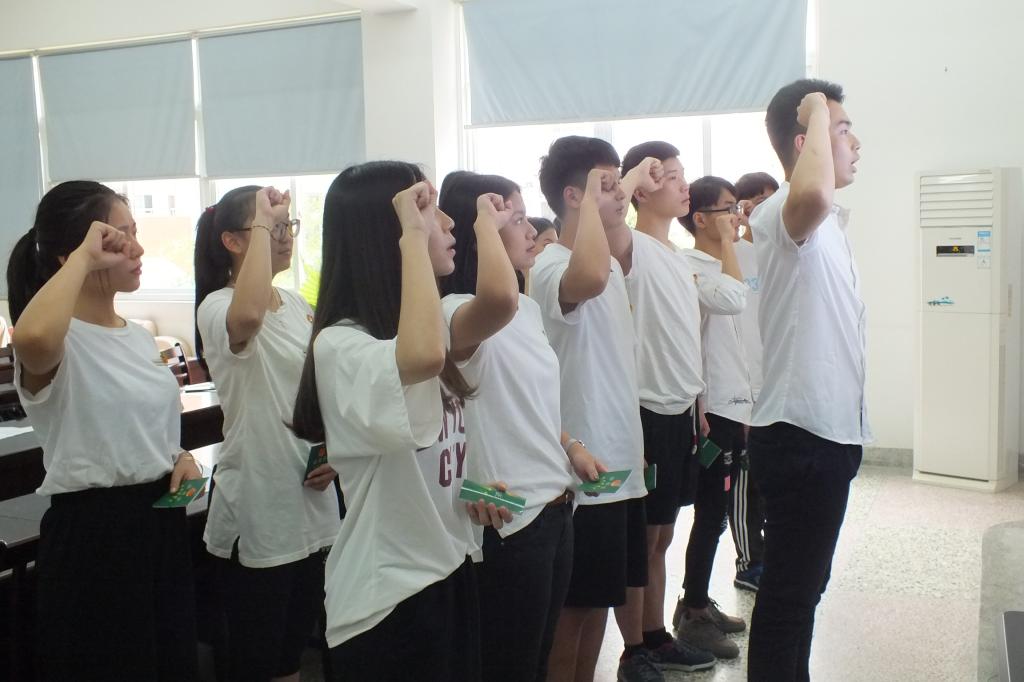 仪式在嘹亮的国歌声中拉开序幕,系团总支书记陈林艺宣读了新团员名单。出席活动的老团干们为新团员佩戴团徽,颁发团证、团章,13名新团员在院优秀团员干部标兵柯宇同学的带领下庄严宣誓。在老师和同学们的共同见证下光荣的加入了共青团。